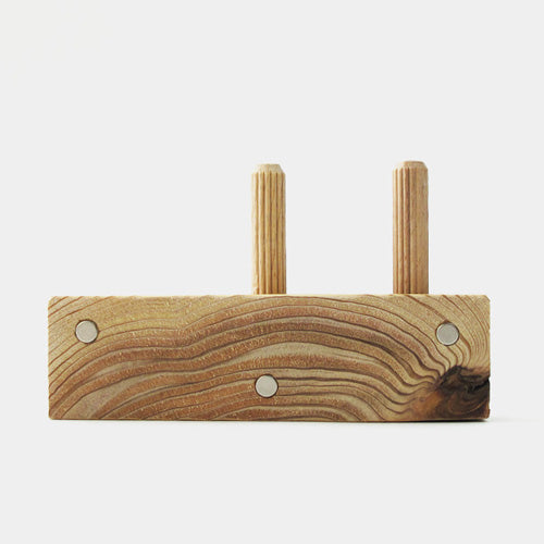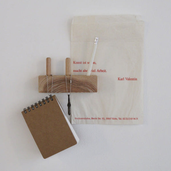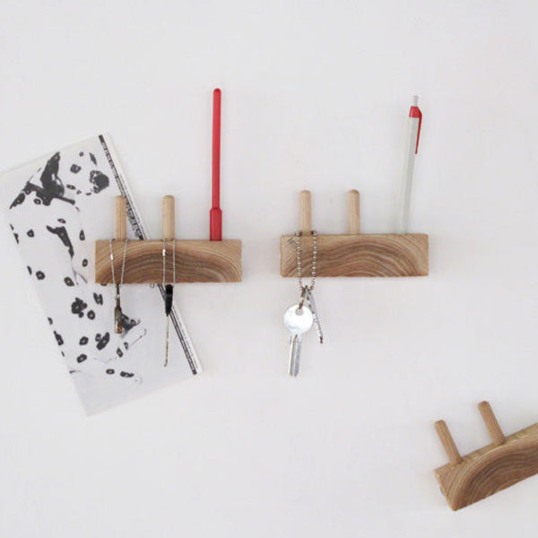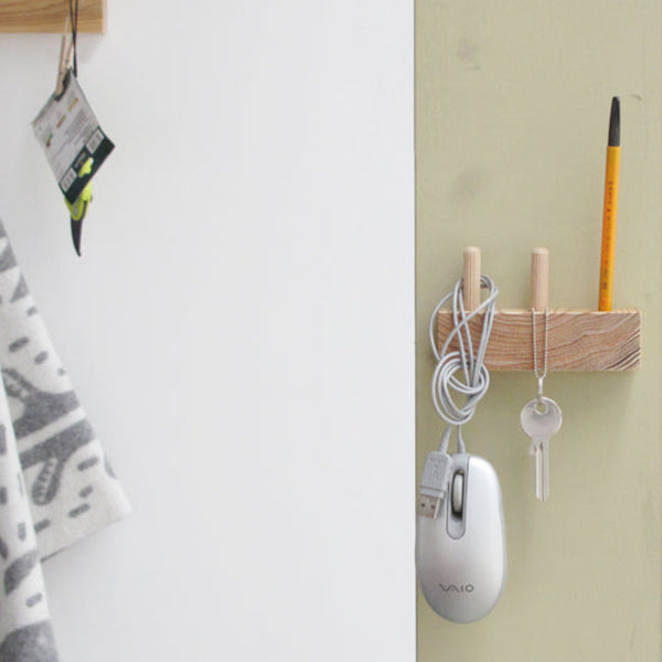 玄関ドア(スチール製)に取り付けておくとちょっと便利。 住宅建材の端材を再利用して作られているのでちょっとエコな作品。