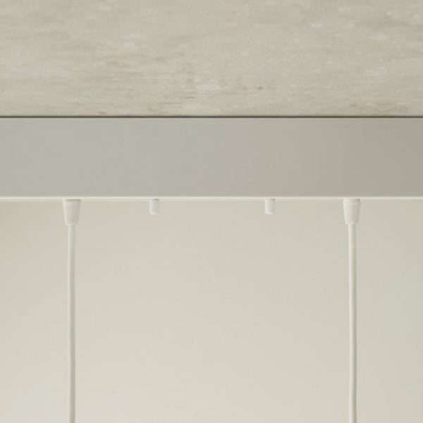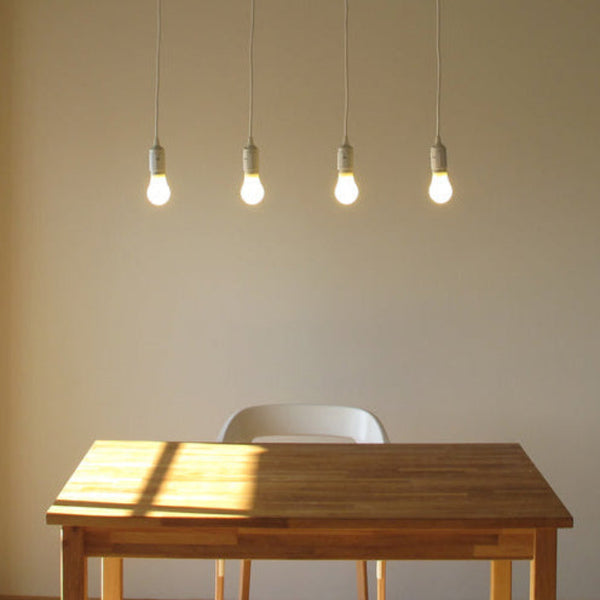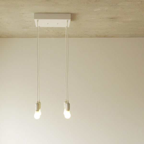白い四角形のスチールボックス、吊り下がった4本の照明ケーブル、静かでミニマルな佇まい、無駄な装飾を排除した4灯照明器具。 ケーブルの長さは1M以内で任意に調節可能。 一つの天井電源(一般家庭用シーリングボディ)から四本の電球ソケットを取り出す事の出来る器具。 4本のケーブルの長さ、4つの電球の大きさや形状、これらのバランス加減によって魅せる無装飾の美。
