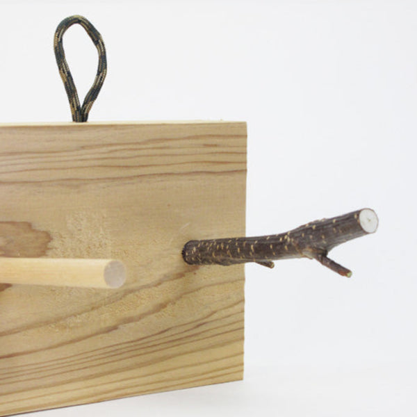 ベースボードに植えられた5つの突起(フック)。 4つは均一に加工された棒、残りの一つは伐採された姿のままの小枝。 上部に埋め込まれたパラコードで2点吊り。